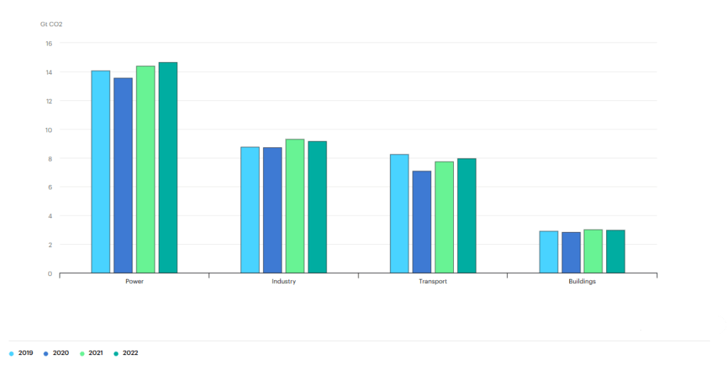 IEA, 2023. Global CO2 emissions by sector, 2019-2022. IEA; Available at: https://www.iea.org/data-and-statistics/charts/global-co2-emissions-by-sector-2019-2022; Last access to: 1st November 2023.